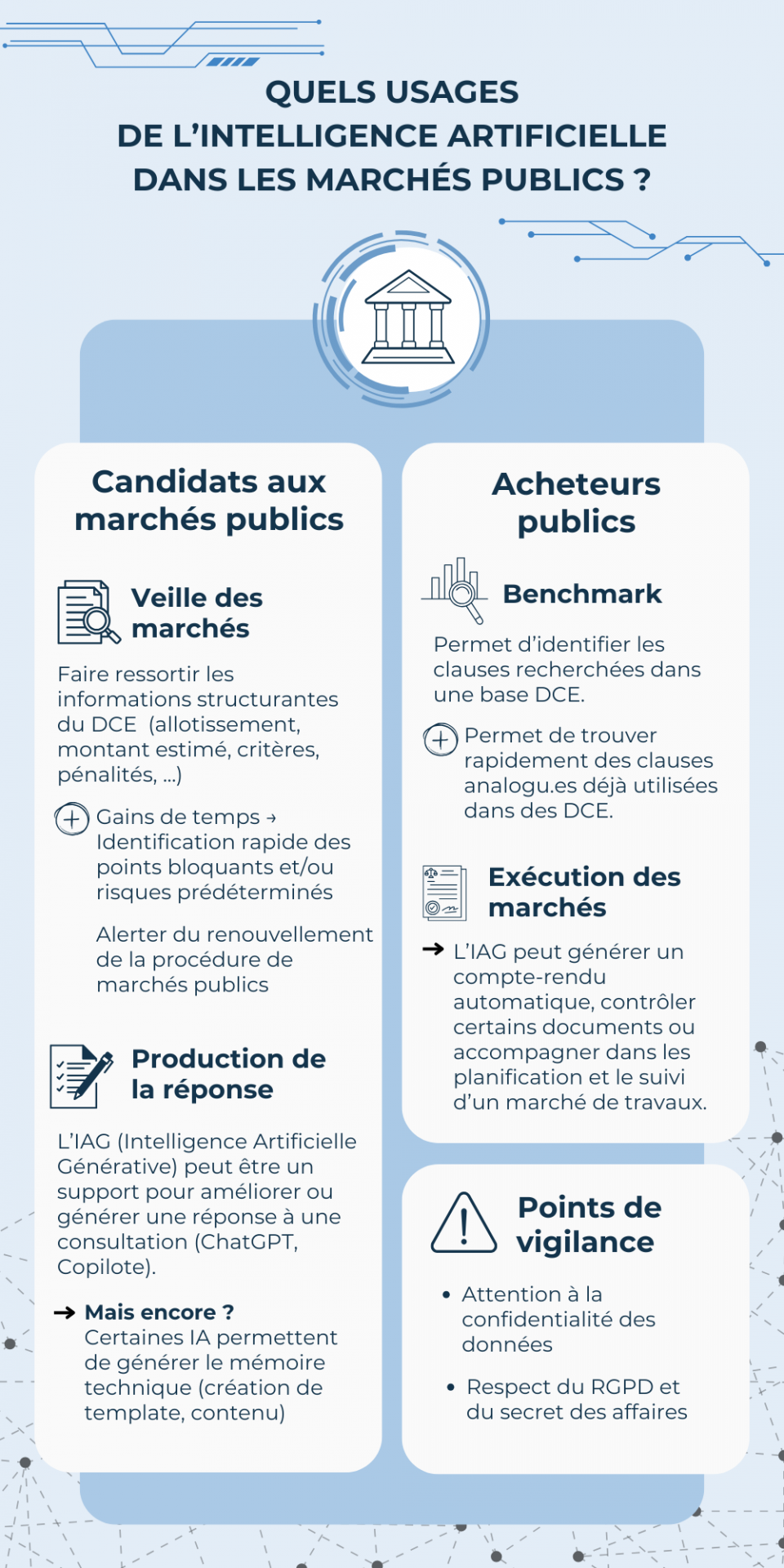 Parallèlement au développement des outils d’IAG « grand public », des outils métiers se développent dans de nombreux secteurs y compris pour les marchés publics tant pour les candidats aux marchés publics que pour les acheteurs publics.